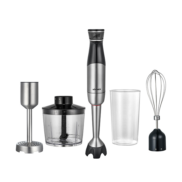 • Hand Blender with stainless steel blade with plastic cover, reduced scratches between metal pots.